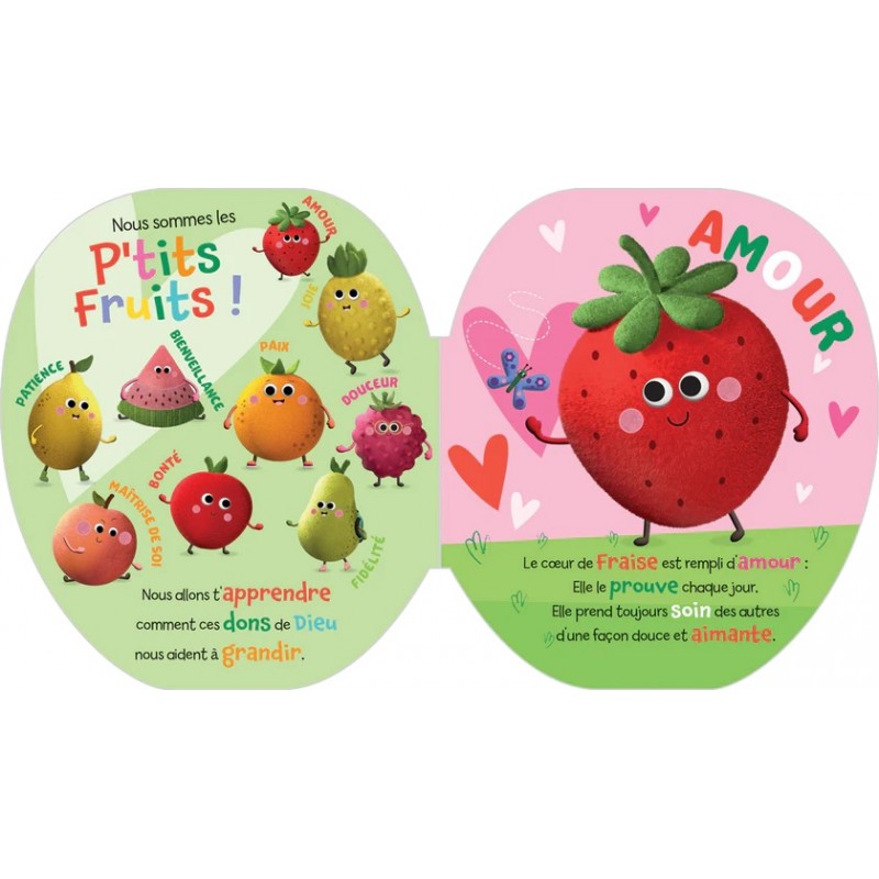 L’amour, la joie, la paix, la gentillesse, la bienveillance, la bonté, la fidélité, la douceur et la maîtrise de soi, sont ici représentés sous la forme de véritables fruits : la fraise – héroïne de ce livre – mais aussi, l’ananas, l’orange, le citron, la pastèque, la pomme, la poire, la framboise et la pêche.